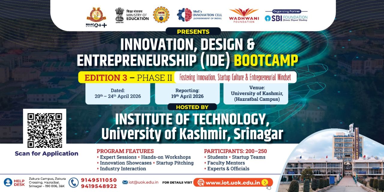 Established as a Centre in the University of Kashmir in March 2021 as “Centre for Innovation, Incubation and Entrepreneurship” (CIIE) is located within the premises of the Institute of Technology, Zakura Campus of the University of Kashmir with a vision to promote Innovation, Incubation and encourage entrepreneurship primarily among students of the Institute of Technology besides catering to entrepreneurial challenges of youth in the area thus equipping them with various valuable skills towards becoming self-sufficient.The Centre encourages young inquisitive minds and backs up/supp