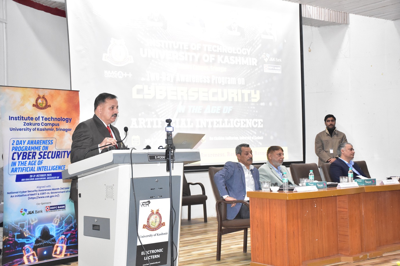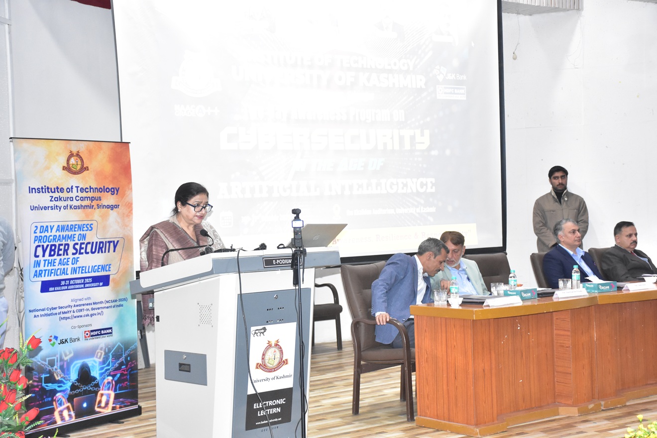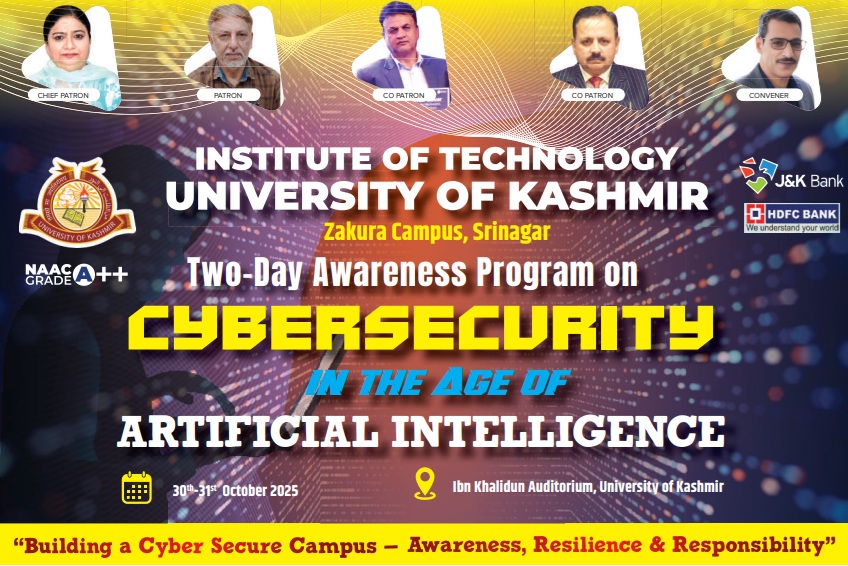 The Centre for Innovation, Incubation and Entrepreneurship (CIIE), Institute of Technology, University of Kashmir (Zakura Campus, Srinagar), organized Two-Day Awareness Program on “Cybersecurity in the Age of Artificial Intelligence” on 30–31 October 2025 at the Ibn Khalidun Auditorium, University of Kashmir.