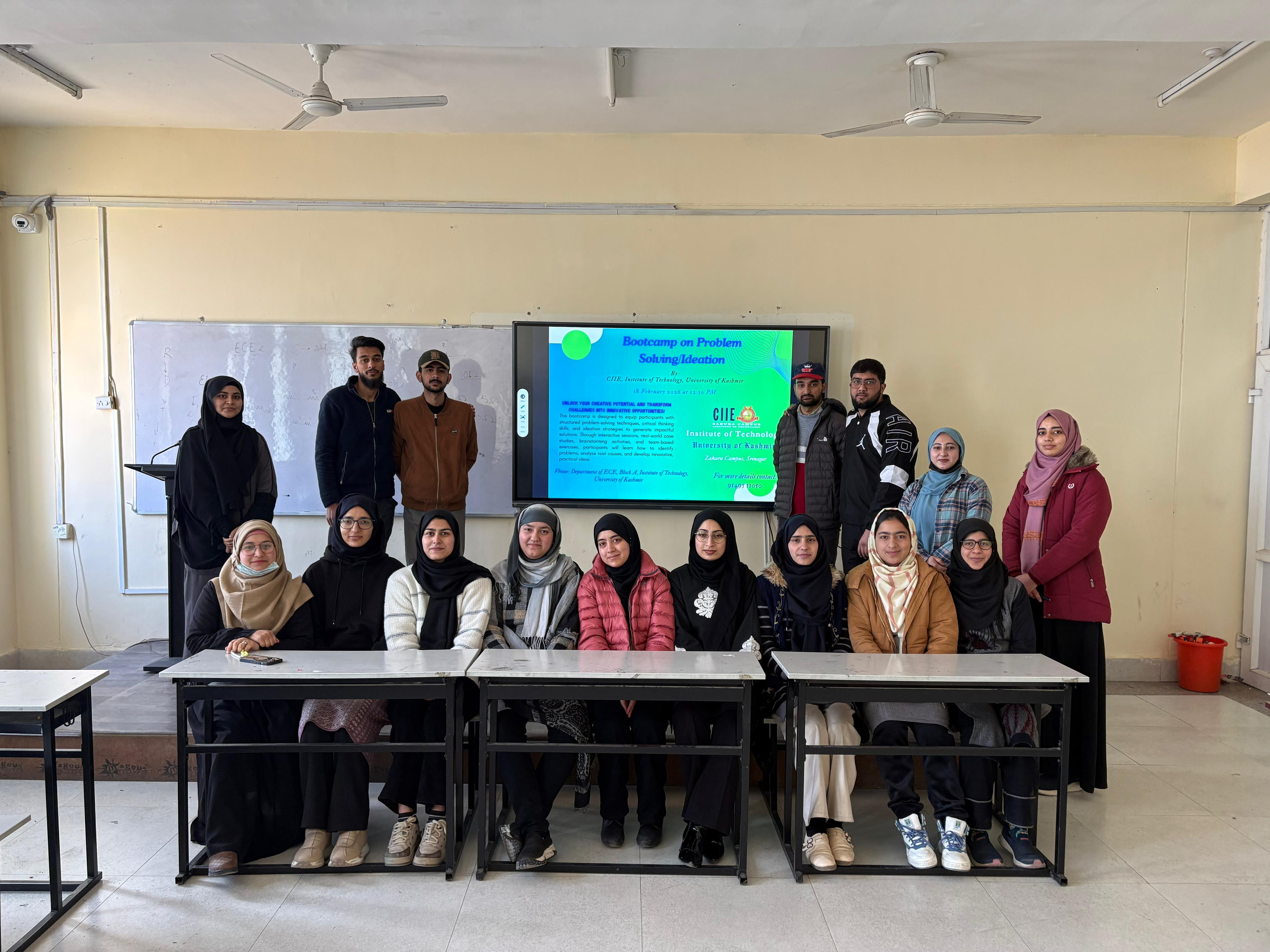 The Bootcamp on Problem Solving and Ideation, organized by the Centre for Innovation, Incubation and Entrepreneurship (CIIE), Institute of Technology, University of Kashmir, was held on 18 February 2026 at 10:30 AM at the Department of ECE, Block A, Institute of Technology, Zakura Campus, Srinagar.